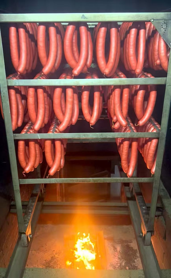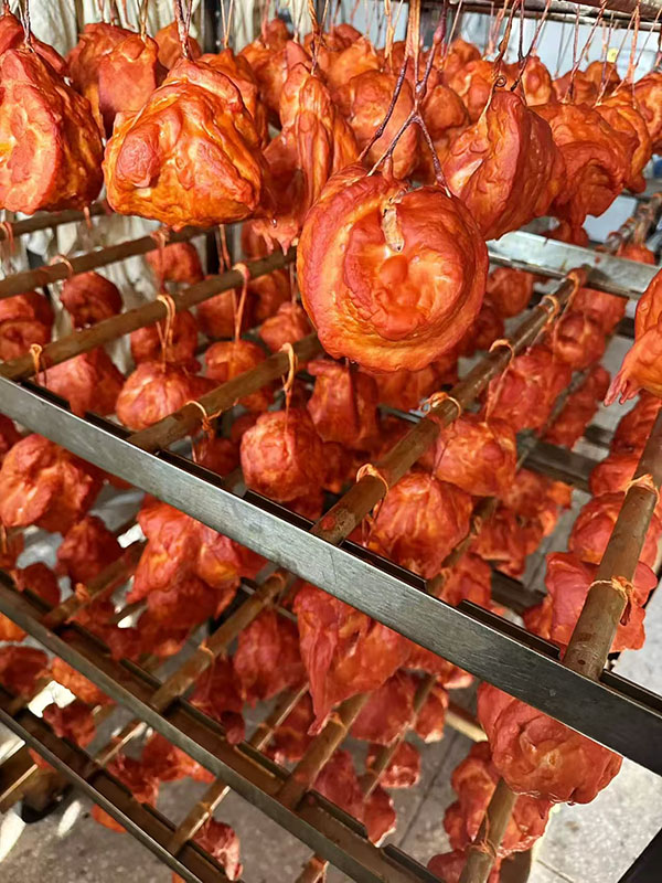 烘烤环节坚守古法,兼顾风味与品质。君喜香肠摒弃现代速烤工艺,采用传统慢火烘烤技法,配备专用烟熏烘烤设备,选用低松脂硬木木屑作为熏烤原料,有效控制苯并(а)芘等有害污染物的产生。烘烤过程中,工人全程值守,控制温度与时间,通过慢火细烟的熏烤,让木材的清香与肉香深度融合,同时慢慢锁住肉汁,使香肠外皮形成酥脆质感,内里保持鲜嫩多汁,每一根香肠都色泽红润、香气浓郁,尽显老东北腊味的独特风味。
